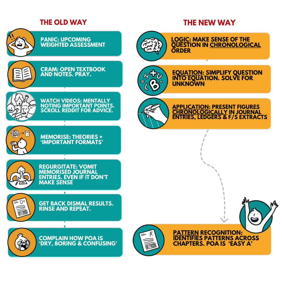 In the decades teaching this subject, we observed how students painfully struggle to memorise steps, journal entries and formats to clear their WAs, MYEs and EOYs - only to achieve dismal results.